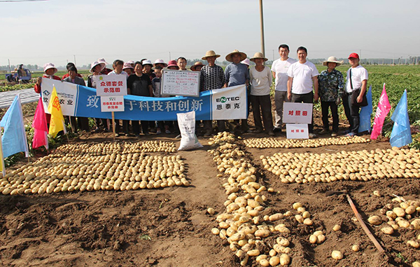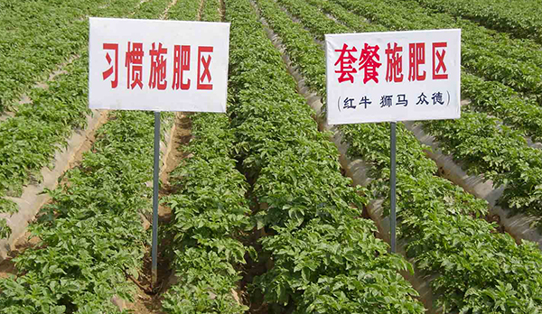 河南鄭州市滎陽高村農(nóng)民黃海望,共種6畝馬鈴薯,其中5畝用的眾德套餐,眾德生物有機肥80公斤,15-10-20高鉀型眾德牌摻混肥100斤在翻地前施用,100斤15-10-20高鉀型眾德牌摻混肥種肥同播,出苗后用態(tài)康科250倍液噴施兩次,另外一畝做對照,同等有機肥,100公斤15-15-15含量的復(fù)合肥作底肥。施用眾德牌摻混肥的馬鈴薯莖葉不旺長,發(fā)根早、根粗、苗壯,中期苗高比對照高15-20厘米,長勢好、病害少,收獲時馬鈴薯個頭大、品質(zhì)好、表面光滑,上市早,賣價高,產(chǎn)量比對照高58-60%,畝產(chǎn)達(dá)到6100多斤。